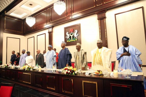 . R-L; Former Governor of Lagos State and APC National Leader, Senator Bola Ahmed Tinubu; former Vice President Alhaji Atiku Abubakar; Chief Justice of Nigeria, Hon Justice Mahmud Mohammed; President of the Senate, Dr Bukola Saraki; President Muhammadu Buhari; South Africa President Mr Jacob Zuma; Vice President Prof Yemi Osinbajo; Speaker of House of Representatives, Rt Hon Yakubu Dogara and two others during a dinner for the visiting President Zuma at the State House in Abuja on Tuesday, 8 March, 2016. PHOTO; SUNDAY AGHAEZE.