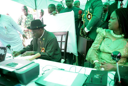 PRESIDENT GOODLUCK JONATHAN BEING REGISTERED BY THE INEC OFFICIALS AT OTUEKE, BAYELSA STATE DURING THE FLAG-OFF