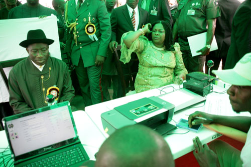 PRESIDENT GOODLUCK JONATHAN AND HIS WIFE PATIENCE DURING THEIR REGISTRATION BY INEC OFFICIALS.
