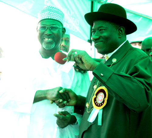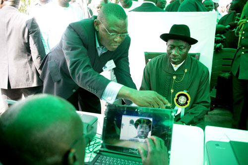 PRESIDENT GOODLUCK JONATHAN DISPLAYING HIS INEC REGISTRATION CARD PRESENTED TO HIM BY THE CHAIRMAN, PROF. ATTAHIRU JEGGA (LEFT) AFTER HIS REGISTRATION.