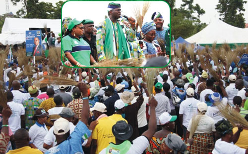 Supporters of the Action Congress of Nigeria during the Mega Rally of the party at the Centre for Management Development, Kosofe Local Government Area, Lagos, on Monday, March 14, 2011. INSET: Lagos State Governor, Mr. Babatunde Fashola SAN (middle) addressing the party supporters. With him are: His running mate, Hon (Mrs) Adejoke Orelope-Adefulire (left) and Deputy Governor of Lagos State, Princess Sarah Adebisi Sosan (right).