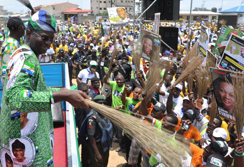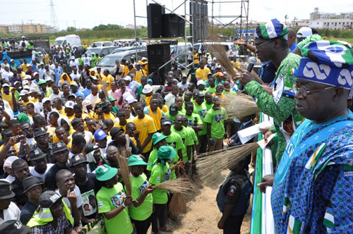Lagos State Governor, Mr. Babatunde Fashola (SAN), acknowledging cheers from party supporters during the Action Congress of Nigeria (ACN) campaign rally at the lkate-Elegushi Open Ground, Etiosa Local Government Lagos on Sunday, March 27, 2011