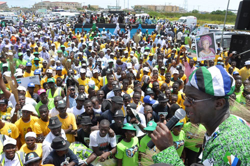 Lagos State Governor, Mr. Babatunde Fashola (SAN), addressing party supporters during the Action Congress of Nigeria (ACN) campaign rally at the lkate-Elegushi Open Ground, Etiosa Local Government Lagos on Sunday, March 27, 2011