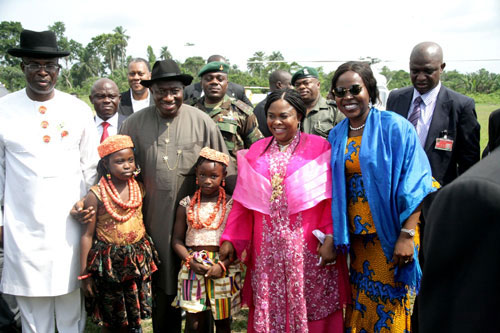 PRESIDENT GOODLUCK JONATHAN, HIS WIFE PATIENCE AND GOV. TIMIPRE SYLVA OF BAYELSA STATE ON THE PRESIDENT'S ARRIVAL IN OTUEKE IN OGBIA LOCAL GOVERNMENT OF BAYELSA STATE TODAY FRIDAY FOR TOMORROW'S NATIONAL ASSEMBLY POLLS.PRESIDENT GOODLUCK JONATHAN WITH HIS WIFE, PATIENCE AND GOV. TIMIPRE SYLVA OF BAYELSA AND WIFE ALAYIGI (RIGHT) AND SOME KIDS DURING THE PRESIDENT ARRIVAL IN OTUEKE, OGBIA LOCAL GOVERNMENT AREA OF BAYELSA STATE TODAY FRIDAY FOR TOMORROW'S NATIONAL ASSEMBLY POLLS.