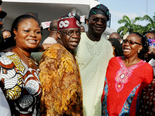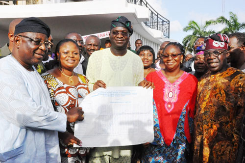 Lagos State Governor Mr. Babatunde Fashola SAN (middle) with his wife Dame. Abimbola Fashola(2nd right), Deputy Governor Elect Hon. (Mrs.) Adejoke Orelope Adefulire (2nd left) receiving the result of the Governorship Election from the State Chairman Action Congress of Nigeria(ACN) Otunba Oladele Ajomale ( left), and Nation Leader (ACN) Asiwaju Bola Ahmed Tinubu at State House Marina , Lagos on Wednesday April 27, 2011
