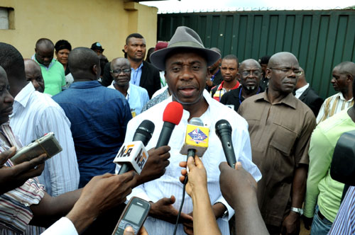Gov.chibuike Amaechi answering questions from newsmen immediately after casting his vote at ward 8 unit 14 ubima,Rivers state.