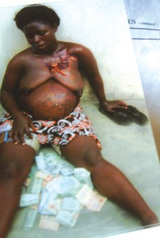 The 35-year old mother of four who is six months pregnant was caught by the police at Mile 2 Motor Park, Apapa, Lagos where she laid her mat and exposed her breasts and stomach to attract sympathy from the public while soliciting financial assistance to treat the fake ailment. The police disclosed that she was arrested following a tip off from members of the public.