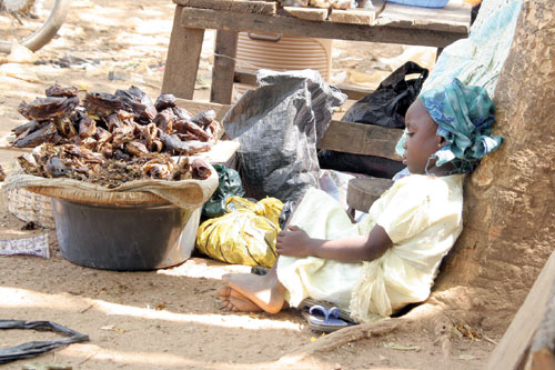 •CHILD LABOUR: A kid selling smoked fish sleeps off by the roadside in Abuja, Nigeria’s capital. PHOTO: FEMI IPAYE.