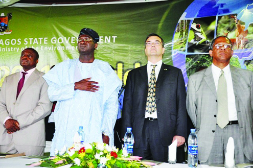 Lagos State Governor, Mr. Babatunde Fashola SAN (2nd left) with the Deputy British High Commissioner in Lagos, Mr. Robin Gwynn (2nd right), Representative of United States Consul General, Mr. Carl Cockburn (right) and the Permanent Secretary(Drainage Services), Ministry of Environment, Mr. Muyideen Akinsanya (left) during the 2011 World Environment Day with the theme, “Forests: Nature at Your Service” held at the Blue Roof, LTV 8, Agidingbi Road, Ikeja, Lagos, on Tuesday, June 21, 2011.