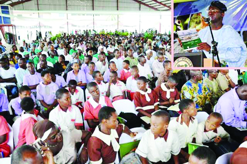 Cross section of participants and school pupils during the celebration of 2011 World Environment Day with the theme, “Forests: Nature at Your Service” held at the Blue Roof, LTV 8, Agidingbi Road, Ikeja, Lagos, on Tuesday, June 21, 2011. INSET: Lagos State Governor, Mr. Babatunde Fashola (SAN) launching a book on the State of the Environment Report-Lagos State 2010 at the venue.