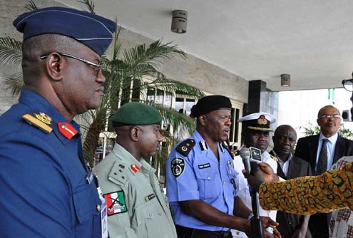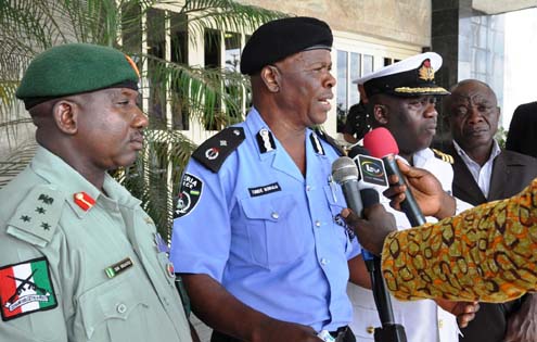 Deputy Commissioner of Police in Charge of Operations, Lagos State Police Command, Mr. Tunde Sobulo (middle) fielding questions from State House Correspondents shortly after the State Security Council Meeting at the Lagos House, Ikeja, on Wednesday, October 5, 2011. With him are: Commander, 9 Brigade, Nigerian Army Ikeja, Brigadier-General Sanusi Nasiru Muazu (2nd left), Air Force Officer, Tony Omenyi (left), Nigerian Navy Cmdr, Enoch Bello (2nd right) and representative, Director SSS, Mr. Ejome Okorokwo (2nd right).