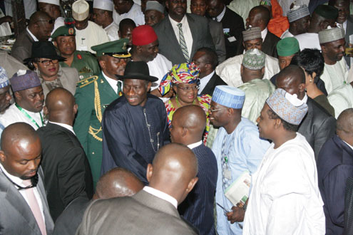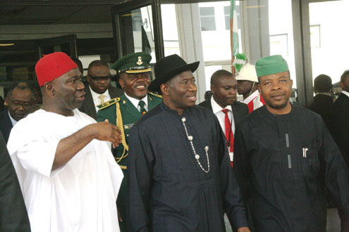 From left, President Goodluck Jonathan, president of the Senate, Sen. David Mark, Deputy Senate President, Ike Ekweremadu and Speaker, House of Representatives, Hon. Aminu Tambuwal