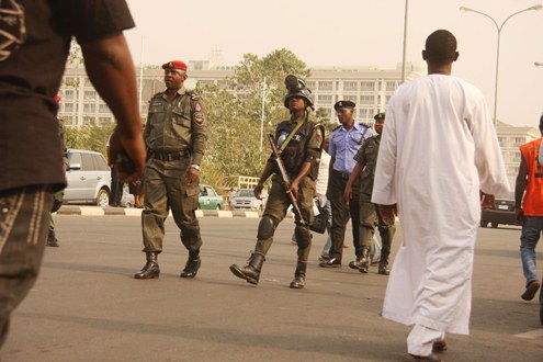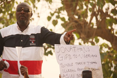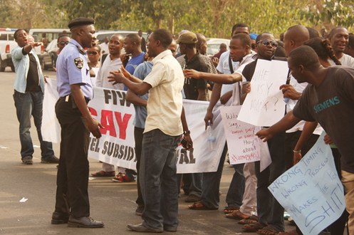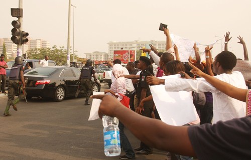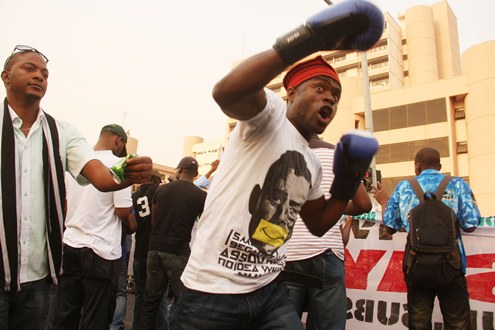 Pictures shows youths and Hon. Dino Melaye protesting on the fuel subsidy removal at the Federal Secretariat,  Abuja Friday. Photos:  Femi Ipaye/TheNEWS.