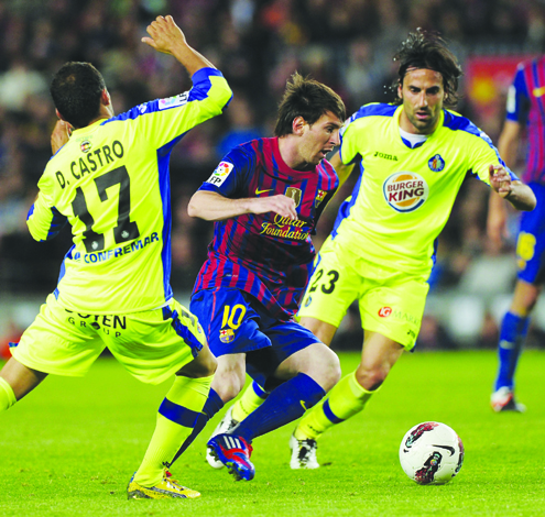 BREAKING LOOSE…Barcelona’s Argentinian forward, Lionel Messi (c) breaks away after dribbling Getafe defender, Diego Castro (l) and Getafe’s defender, Ivan Marcano Sierra during their Spanish league match at the Camp Nou Stadium, Barcelona on Tuesday, 12 April, 2012. AFP PHOTO.