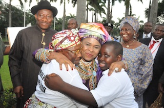 Dame Patience Jonathan, wife of Nigeria’s president returned to Nigeria from Germany Wednesday to the warm embrace of a large crowd at the Nnamdi Azikiwe International Airport in Abuja and denied reports that she travelled abroad to receive treatment for a terminal illness.