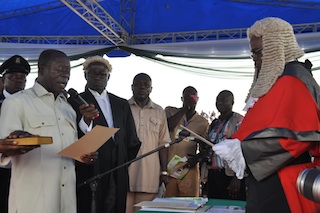 Justice Cromwell Idahosa, Chief Judge of Edo State , swore in the Deputy Governor Egberanwem Pius Odudu and Governor Adams Oshiomhole at 11. 45 am.