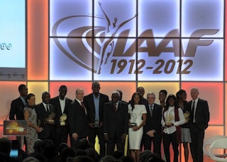 (From3rdL) Kenya’s athlete David Rudisha, Prince Albert of Monaco, Jamaica’s athlete Usain Bolt, IAAF (International Association of Athletics Federations) President Lamine Diack and US sprinter Allyson Felix pose at the end of the IAAF (International Association of Athletics Federations) Athlete of the Year 2012 Award marking the centenary of IAAF on November 24, 2012 in Barcelona.