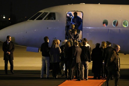 Blankets draped over their shoulders against the early-morning chill and smiling broadly, they stepped off the plane and into the arms of relatives before retiring to the airport’s VIP pavilion.