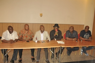 Senator Wilson Ake with mic (centre), Hon. Andrew Uchendu (left), Hon. Sokonte Davice (left), Hon. Maurice Pronen (extreme left), Hon. Asita Honourable  (immediate right) and Hon. Ogbonna Nwuke briefing the press on the forthcoming Save Rivers Movement rally at Khana LGA.