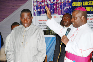 President Goodluck Jonathan receiving benedictions from a Catholic Bishop