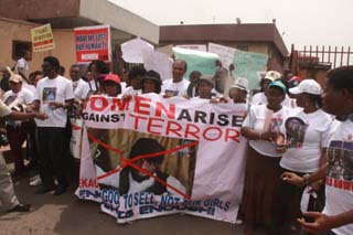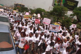 The protesters wore white T-shirts with the inscription, “Women Arise Against Terror” and marched from the Lagos State Television premises through Awolowo Way, Ikeja to the State House, Ikeja, to deliver a protest letter to Governor Babatunde Fashola for onward delivery to President Goodluck Jonathan in Abuja, Nigeria’s capital. The protest, organised by Women Arise Initiative, marked the second time women took to the streets of Lagos to protest the release of the abducted children girl, in what has become a popular cliché: “Bring Back Our Girls.”