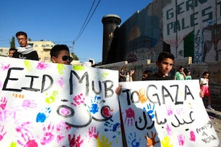 Young Palestinians hold placards reading "Eid Mubarak to Gaza" (Happy Eid to Gaza) during a demonstration in solidarity with the children killed