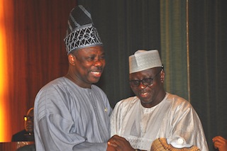 GOVERNOR IBIKUNLE AMOSUN OF OGUN STATE WITH HIS NASARAWA STATE COUNTERPART, GOVERNOR TANKO AL-MAKURA DURING A MEETING ON EBOLA VIRUS BETWEEN PRESIDENT GOODLUCK JONATHAN , STATE GOVERNORS AND THEIR HEALTH COMMISSIONERS ON 13 AUGUST AT THE STATE HOUSE IN ABUJA