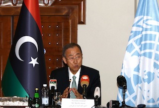 UN Secretary General Ban Ki-moon speaks to the press upon his arrival in Tripoli, Libya