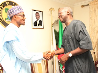 All Progressives Congress Presidential Aspirant and former  Head of State, Major-General Muhammadu Buhari (left) welcomed by Lagos State Governor, Mr. Babatunde Fashola, SAN (right) during a visit to invite the   Governor to his Presidential bid declaration at the State House, Marina, Lagos on Sunday, October 12, 2014