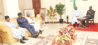 Lagos State Governor, Mr. Babatunde Fashola, SAN (right), All Progressives Congress Presidential Aspirant and former Head of State, Major-General Muhammadu Buhari (2nd right), former Speaker, House of Representatives,  Alhaji Aminu Bello Masari (middle), former Governor of Bayelsa State, Hon. Timipre Sylva (2nd left) and former Minister of the Federal Capital Territory, Mallam Nasir El-Rufai (left) during a visit to invite the Governor to the Presidential bid declaration of Major-Gen Buhari at the State House, Marina, Lagos on Sunday, October 12, 2014