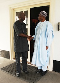 All Progressives Congress Presidential Aspirant and former  Head of State, Major-General Muhammadu Buhari (left) being welcomed by Lagos State Governor, Mr. Babatunde Fashola, SAN (right) during a visit to invite the Governor to his Presidential bid declaration at the State House, Marina