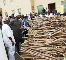 Lagos State Governor, Mr. Babatunde Fashola, SAN (2nd left) presenting a outboard engines to the Fish Production Farmers while Commissioner for Agriculture and Cooperatives, Prince Gbolahan Lawal (left) watches with admiration during the 2014 World Food Day/Agric Value Chains Empowerment with the theme, “Feeding the World, caring for the Earth”, organized by the Lagos State Ministry of Agriculture and Cooperatives at the Johnson Agiri Agricultural Complex, Oko-Oba, Agege, Lagos on Thursday, October 16, 2014.Governor Babatunde inspecting the agricultural produce during the 2014 World Food Day/Agric Value Chains EmpowermentGovernor Babatunde inspecting the agricultural produce during the 2014 World Food Day/Agric Value Chains Empowerment