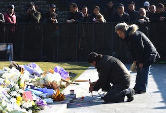A couple burns incense at the site of a New Year’s Eve stampede at the Bund in Shanghai