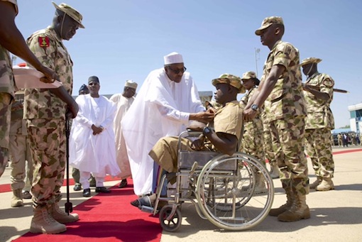 President Muhammadu Buhari honours an injured soldier