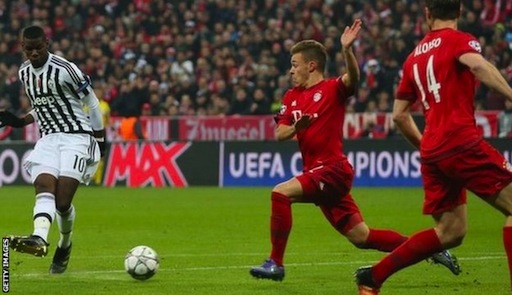 On a number of occasions Juve were able to bisect Bayern’s defence with one pass. Manuel Neuer, in particular, looked harassed by Juve’s high-tempo style. He gambled and lost early on, rushing off his line and allowing Stephan Lichtsteiner’s shot to ricochet off him into the path of Pogba, who side-footed home into an unmanned net.