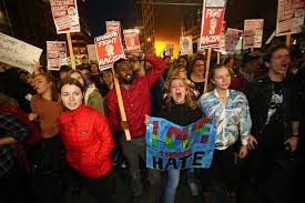 They also blocked the streets and chanted “No more hate, ” and carried anti-Trump slogans: “Not my president”, “No Trump”, “No racist”, among others.