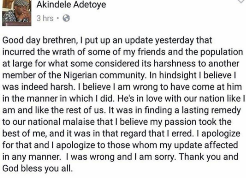 According to Adetoye, his initial post about 2face had incurred the wrath of his friends and Nigerians. He has realised he was harsh and wrong and for that, he’s sorry.