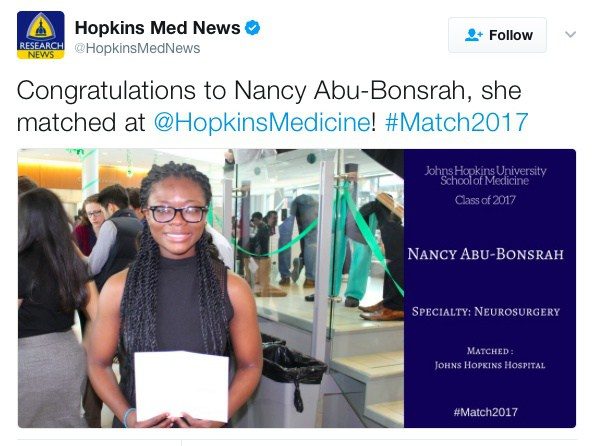 Abu-Bonsrah lived in Ghana until she was 15, and also attended Johns Hopkins medical school. Abu-Bonsrah got even more good news with her acceptance letter: Her husband, Kwabena Yamoah, was also accepted to a Johns Hopkins residency program.