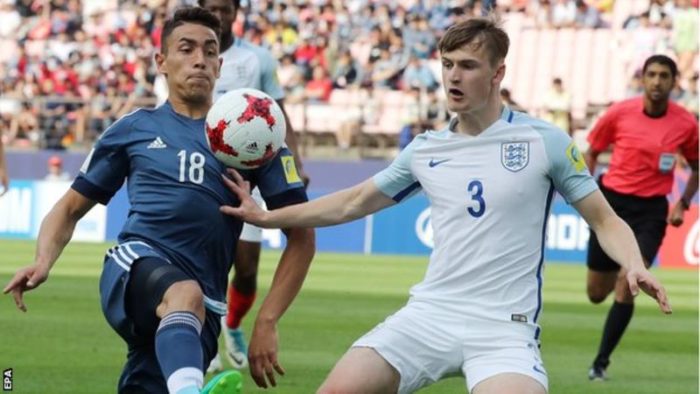England began their Under-20 World Cup campaign in South Korea with a 3-0 victory over an Argentina side reduced to 10 men after the intervention of a video assistant referee.