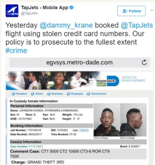 According to the airline, 24-year old Dammy Krane had the Jet App on his Samsung Galaxy S7 with which he made the bookings, and he continued to use different cards for the transaction until he used up to five.