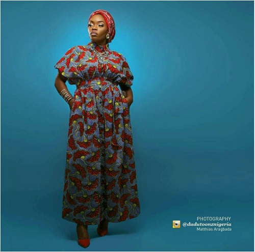For the shoot, Bisola paired her Ankara print dress with a red sequin turban, statement accessories and finished her look with red pumps.