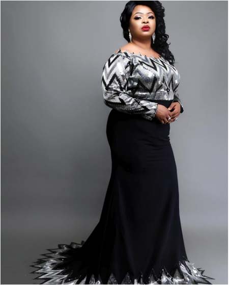 For her birthday shoot, Dayo sparkled in a black floor-length dress featuring an upper sequin cut and long sleeves.