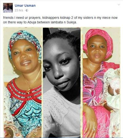 A man raised an alarm yesterday, saying his mum, aunt and his aunt’s daughter were kidnapped on their way to Abuja around Lambata and Suleja.