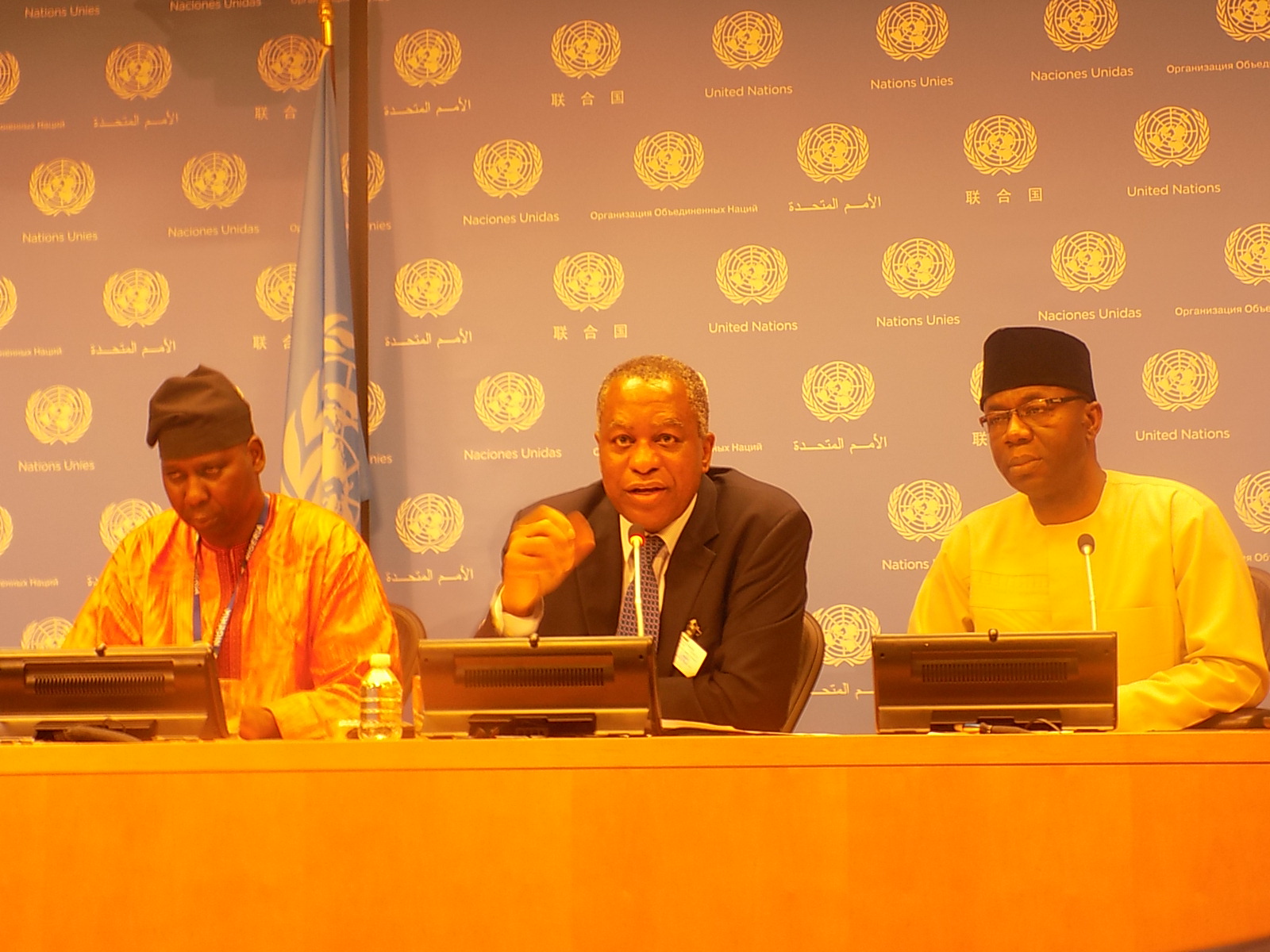 Minister of Foreign Affairs Geoffrey Onyeama addressing a news conference on Friday evening at the UN headquarters, New York. With him are Permanent Representative of Nigeria to the UN, Prof. Tijjani Bande (R) and Deputy Permanent Representative of Nigeria to the UN, Amb. Samson Itegboje (L).