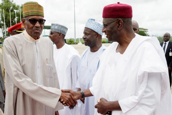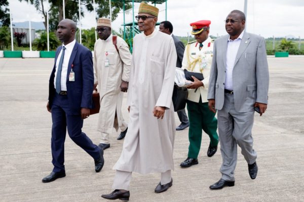 The president, accompanied by the governors of Zamfara, Ebonyi and Ondo states as well as key cabinet ministers, would transit through London on his way back to the country.