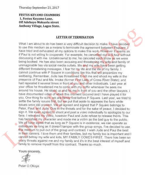 In a report by LIB, Peter has reportedly sent to their lawyer Festus Keyamo a demand for the termination of the agreement between the group – P-Square.