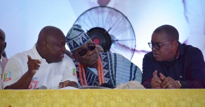 L-R: Lagos State Governor, Mr. Akinwunmi Ambode, with Oba of Lagos, Oba Rilwan Akiolu I and Senator Gbenga Ashafa, representing Lagos East Senatorial District during the 4th Quarter 2017 Town Hall meeting at the SUBEB Proposed Permanent site in Ojota, Kosofe, Lagos, on Tuesday.