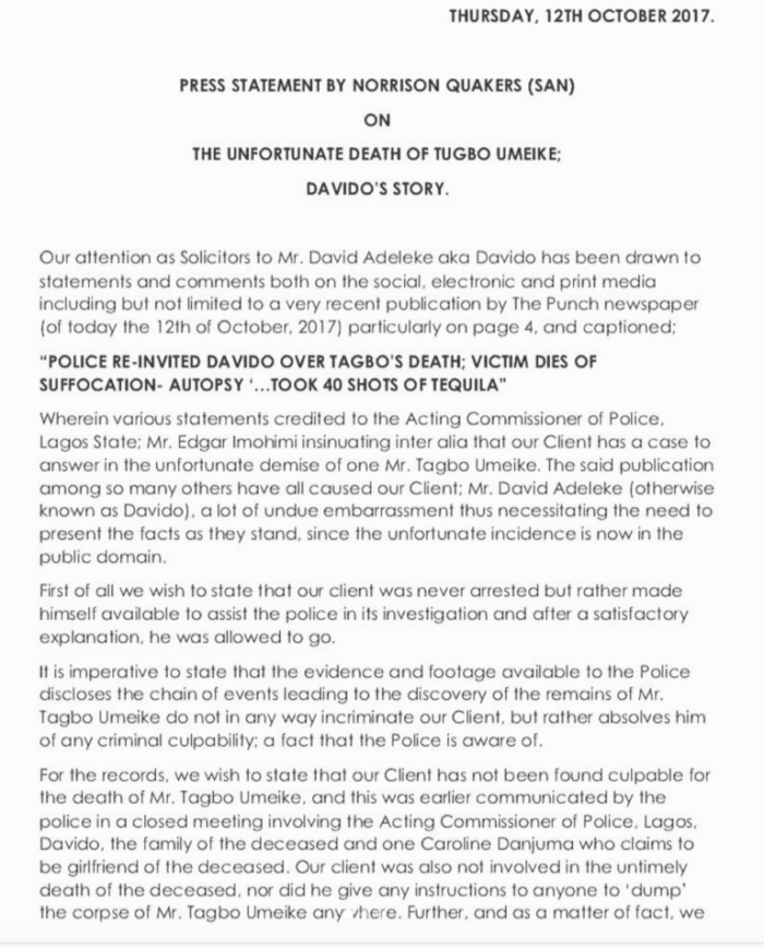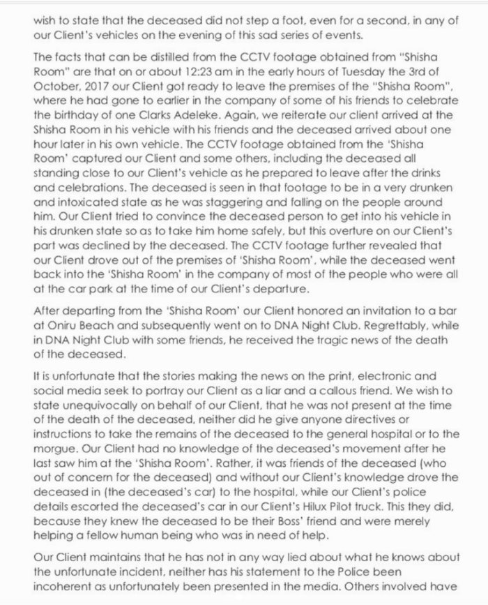 The statement further says that the deceased did not step foot in Davido’s car at Shisha Room to further prove his innocence as at the time of the incident.