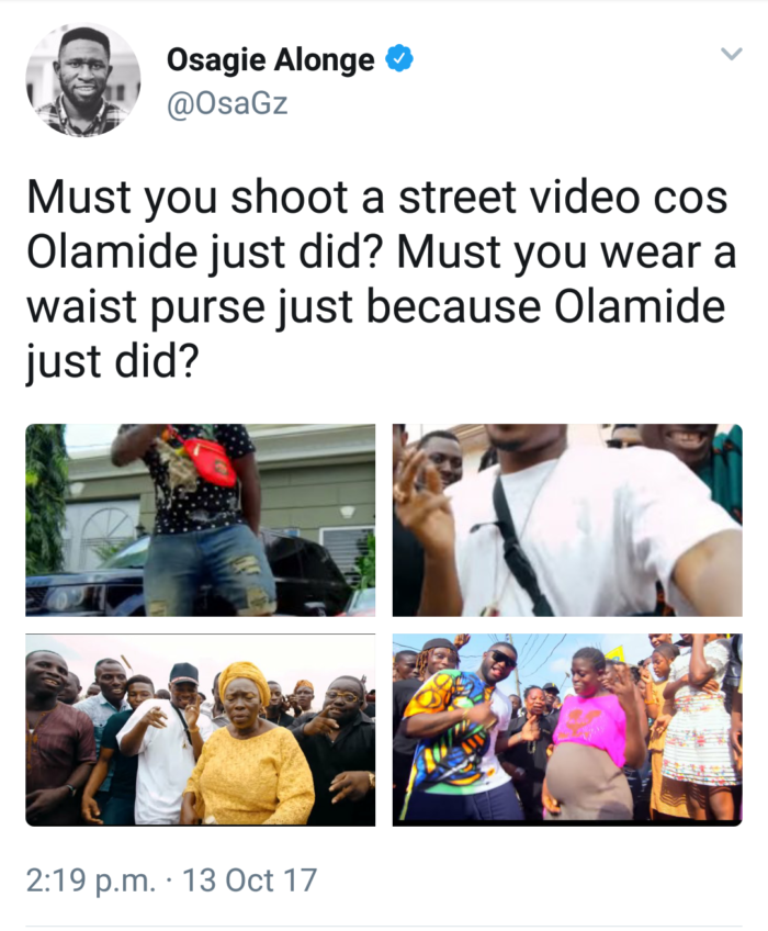 “Must you shoot a street video cos Olamide just did? Must you wear a waist purse just because Olamide just did?”