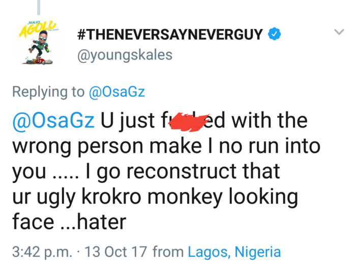 @OsaGz U just f**ked with the wrong person make I no run into you ….. I go reconstruct that ur ugly krokro monkey looking face …hater
